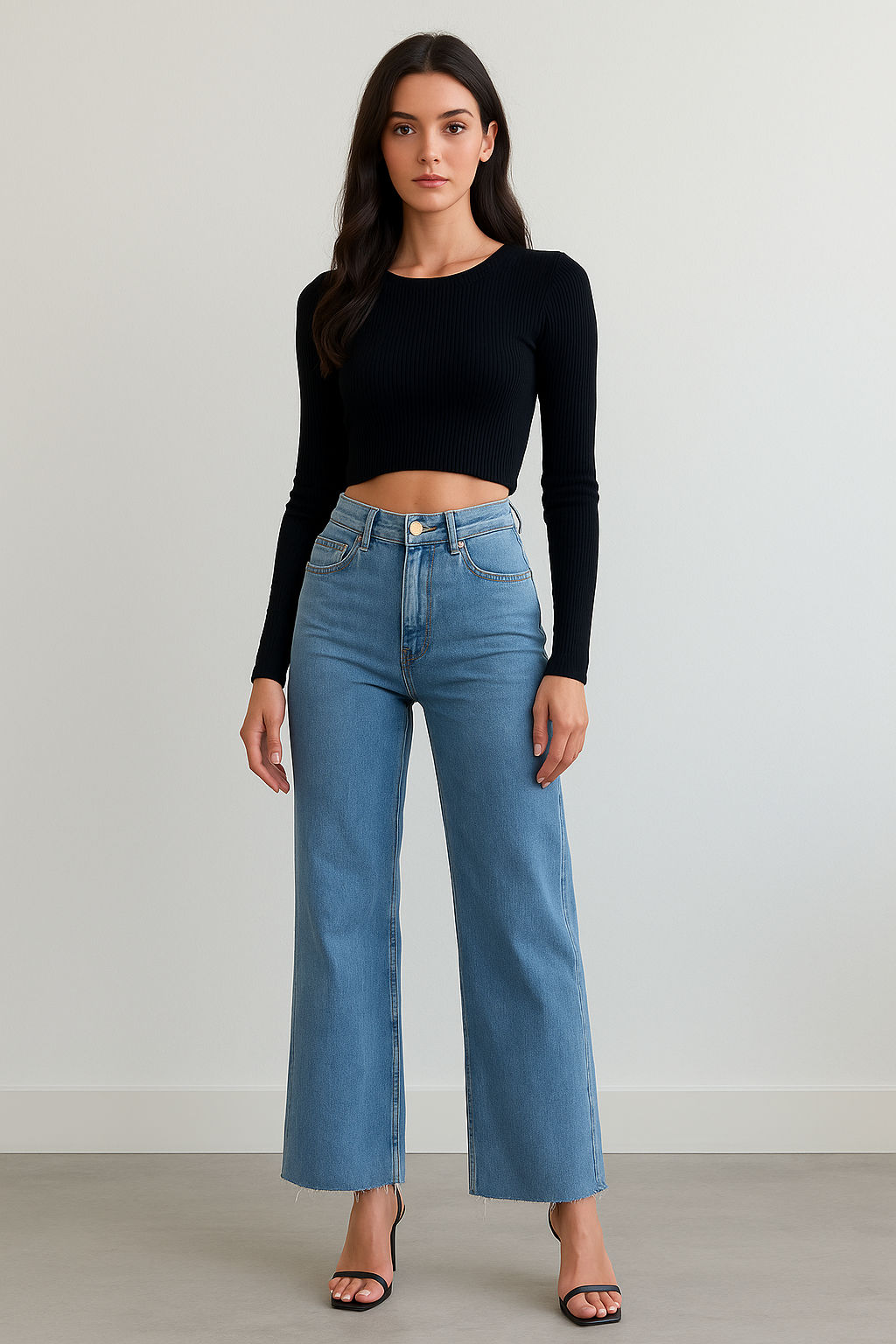 Dámské džíny s vysokým pasem a širokými nohavicemi – ideální pro každodenní outfit i elegantnější kombinace. Jsou vyrobeny z příjemné směsi bavlny a polyesteru, která zajišťuje pohodlí i pružnost. Perfektně tvarují postavu a skvěle ladí s crop topy nebo halenkami zastrčenými do pasu.