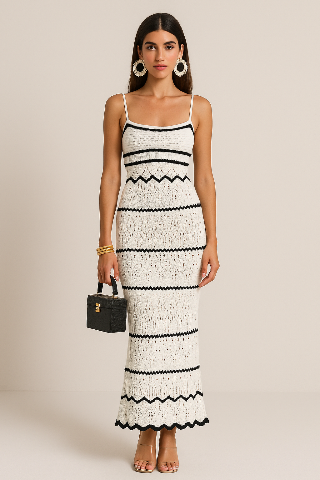Dlouhé pletené šaty s tenkými ramínky a mírně přiléhavým střihem. Krásně zvýrazní postavu a zároveň působí elegantně díky jemnému vzoru. Ideální na léto, dovolenou nebo procházku městem.